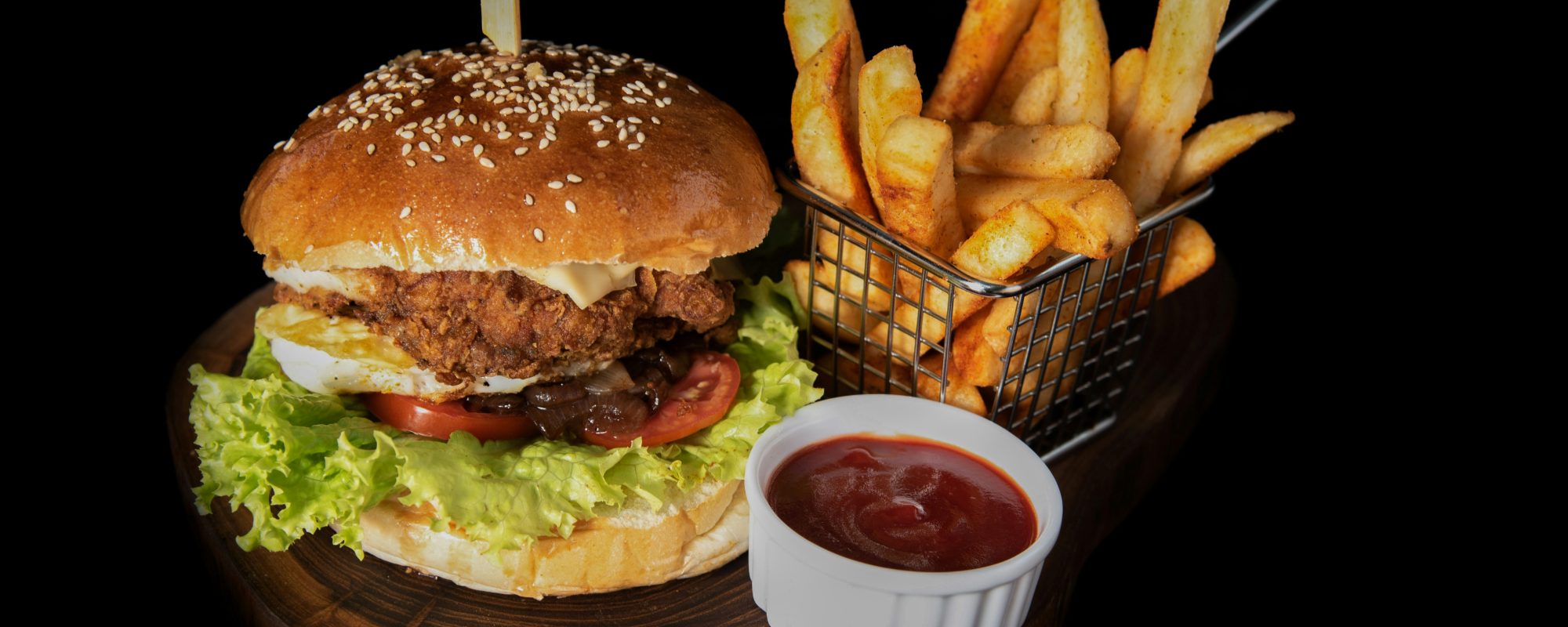 soczysta wołowina, kurczak panierowany, 2x ser cheddar, 2x mimolette, chrupiący boczek, ogórek konserwowy, czerwona cebula, smażony panierowany ser, krążki cebulowe, cheese cheddar nuggets, 2 sosy do wyboru